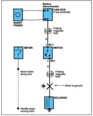 A short finder is available to locate a short to ground. The short finder creates a pulsing magnetic field in the shorted circuit and shows you the location of the short through body trim or sheet metal.