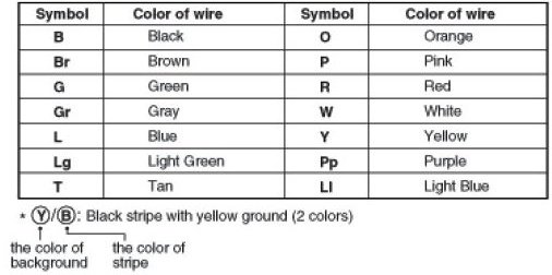 The following abbreviations are used to identify wire colors in the circuit schematics.