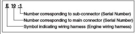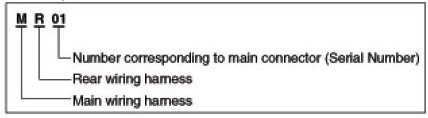 A Connector identification symbol consists of a wiring harness location classification symbol corresponding to a wiring harness location and number corresponding to the connector.