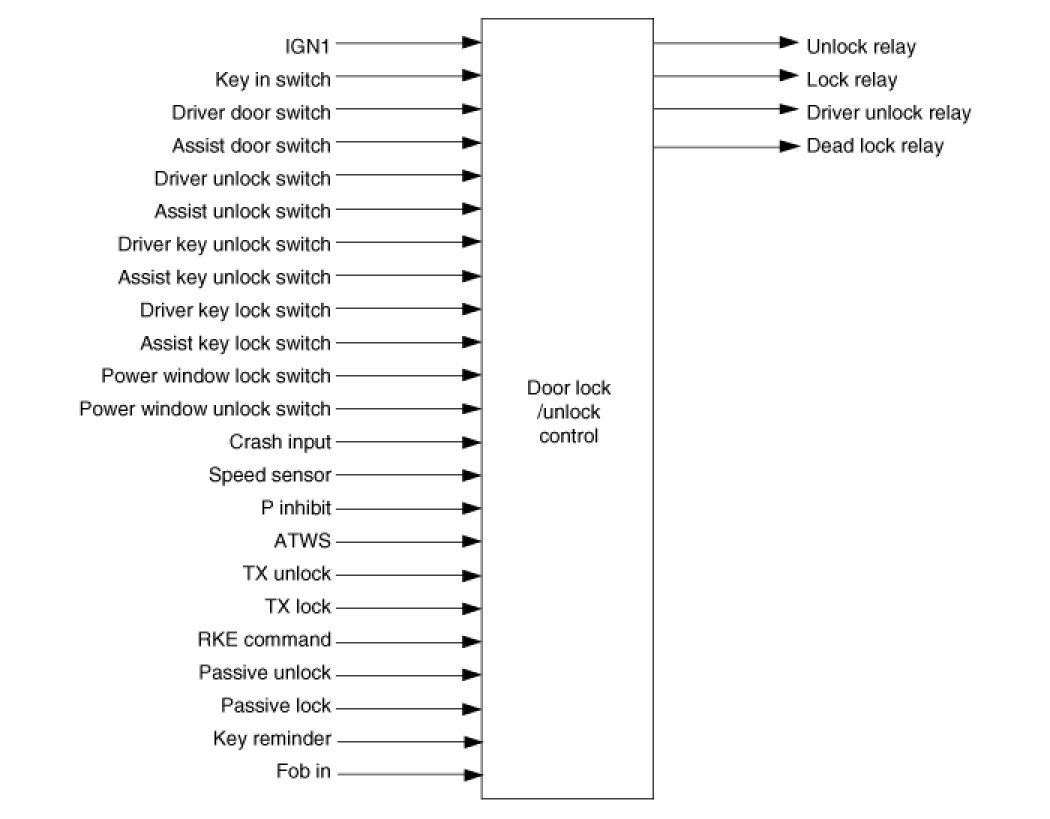 (2) Perform Unlock Relay output for 1s after 0.5s when the condition becomes to be KEY IN = ON& Driver Door open Switch = OPEN & Driver Door Unlock Switch = LOCK(Regions for North America).