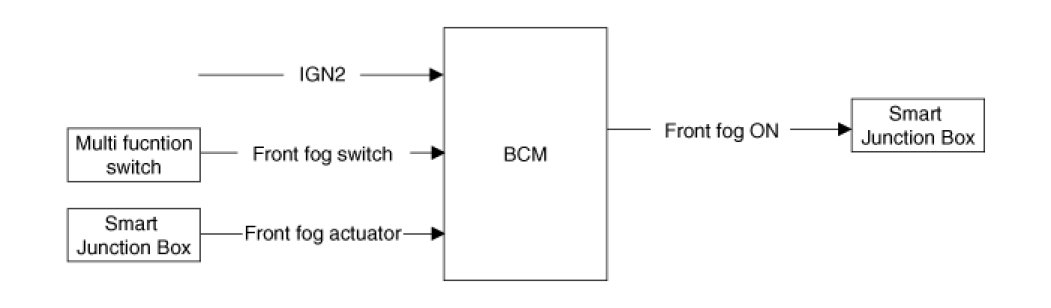 (1) In case of (IGN2=ON) & (HeadLampLow=ON) & (HeadLampHigh=Off), if Front fog lamp switch input is detected (FrontFogSW=On), Front fog lamp output (FrontFogON=On) is turned ON.