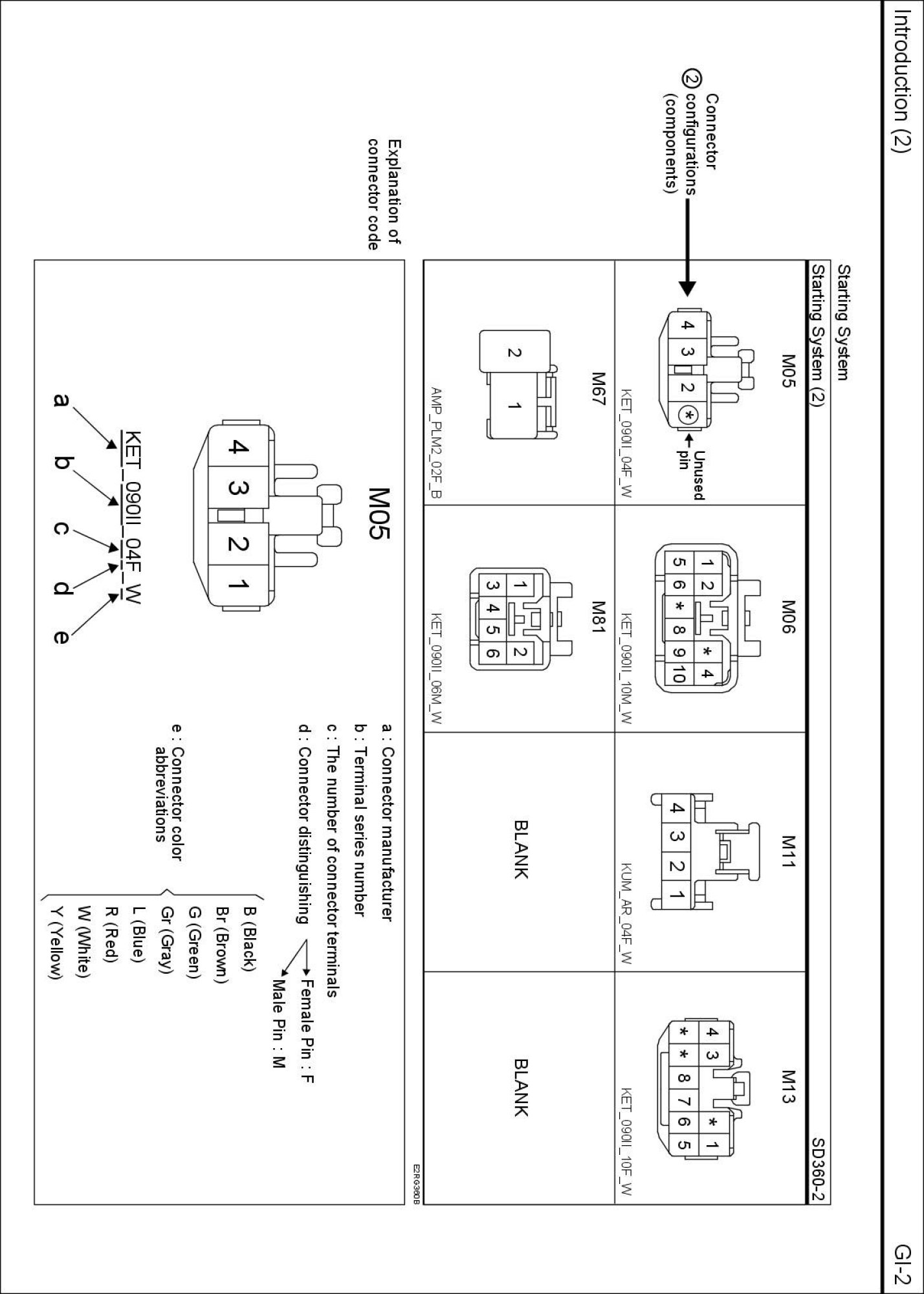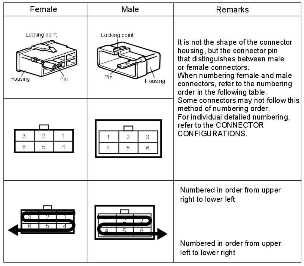 - It shows the front of the connector on the harness side when not to the harness connector. The terminal number on each connector can be obtained by following the pattern used in (5) connector view and numbering order. Unused terminals are marked with an asterisk (*).