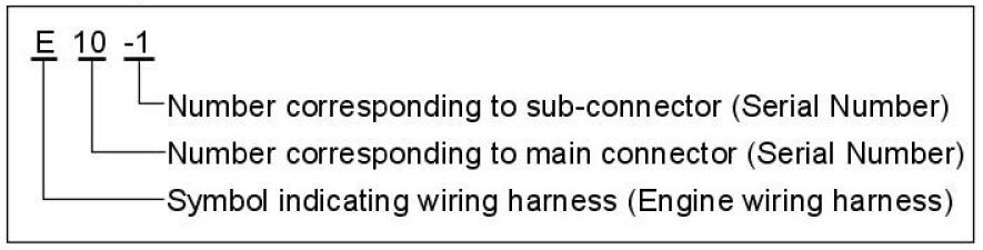 A Connector identification symbol consists of a wiring harness location classification symbol corresponding to a wiring harness location and number corresponding to the connector.