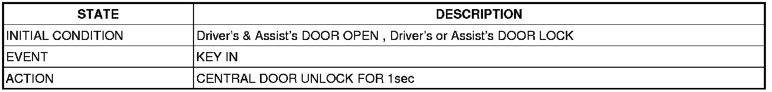 * At DR LOCK in POWER WINDOW SWITCH or CAN LOCK signal reception,With UNLOCK KNOB state independently Lock output Display during 0.5S ± 0.1 secs. At DR UNLOCK in POWER WINDOW SWITCH or CAN UNLOCK signal reception Offer an Unlock output during 0.5 ± 0.1 secs independently with UNLOCK KNOB state. (IGN 1/2 input disregard)