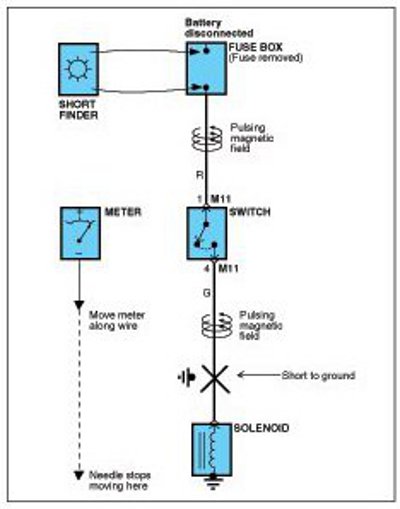 A short finder is available to locate a short to ground. The short finder creates a pulsing magnetic field in the shorted circuit and shows you the location of the short through body trim or sheet metal.