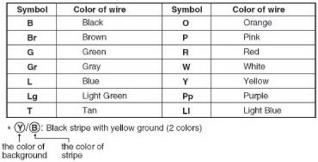 The following abbreviations are used to identify wire colors in the circuit schematics.