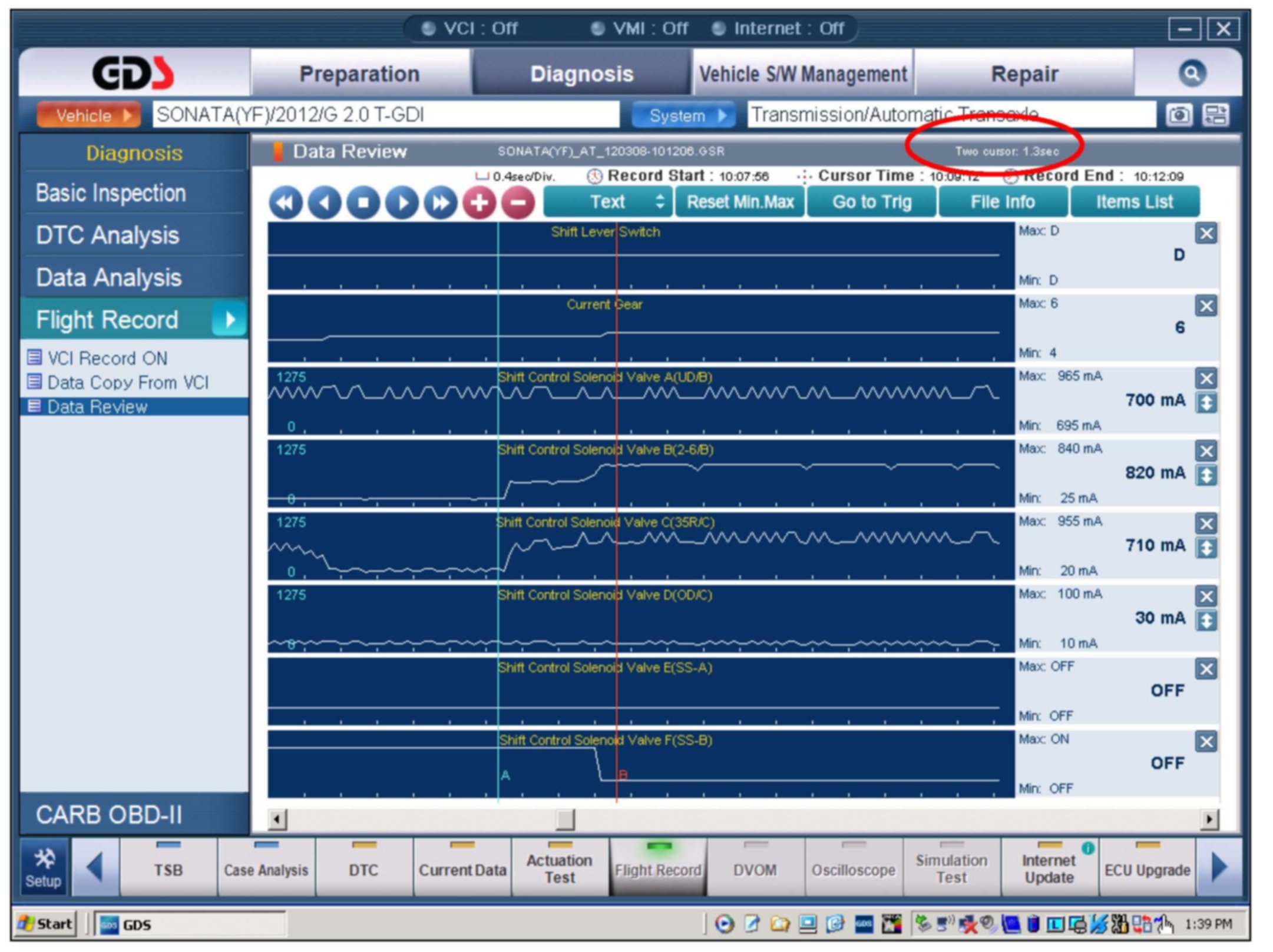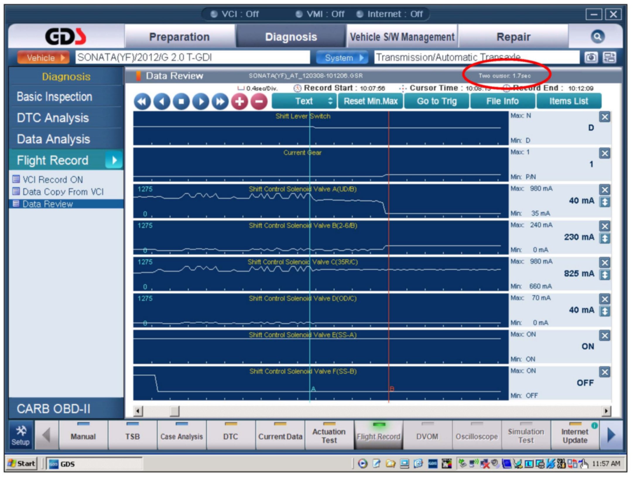 1. Attach the GDS and check for Diagnostic Trouble Codes in both the "Engine" and "Automatic Transaxle" menu. If DTCs are found, repair according to the appropriate TSB or shop manual.