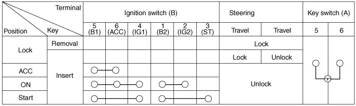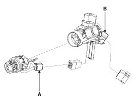1. Disconnect the ignition switch connector (B) and key switch connector (A) from under the steering column.