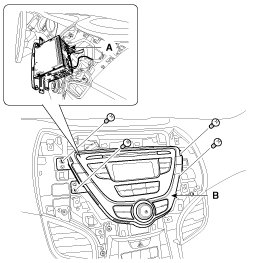 4. After leasing the mounting screws, disconnect the connector (A), and then remove the center audio assembly (B).