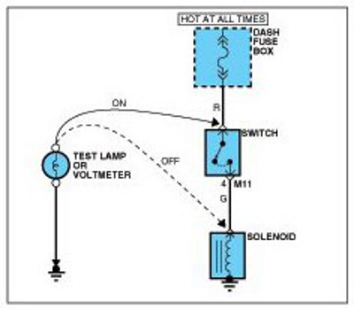A. Connect one lead of a test lamp or voltmeter to a ground. If you are using a voltmeter, be sure it is the voltmeter's negative test lead you have connected to ground.