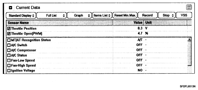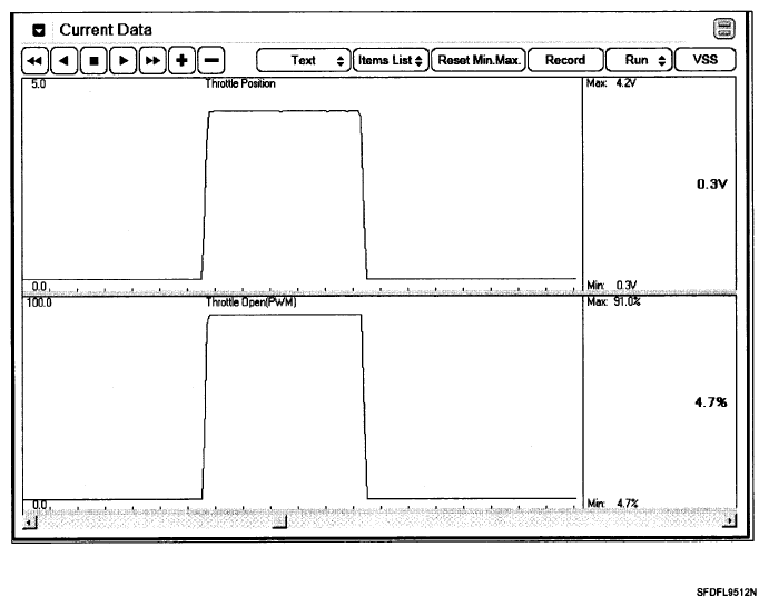 | Normal value with engine ON & accelerator pedal fully depressed | 4.2 ~ 4.7 V | - | |