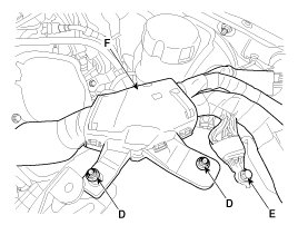 4. Remove the harness installation nut (D) and ground bolt (E), and then remove the harness (F).