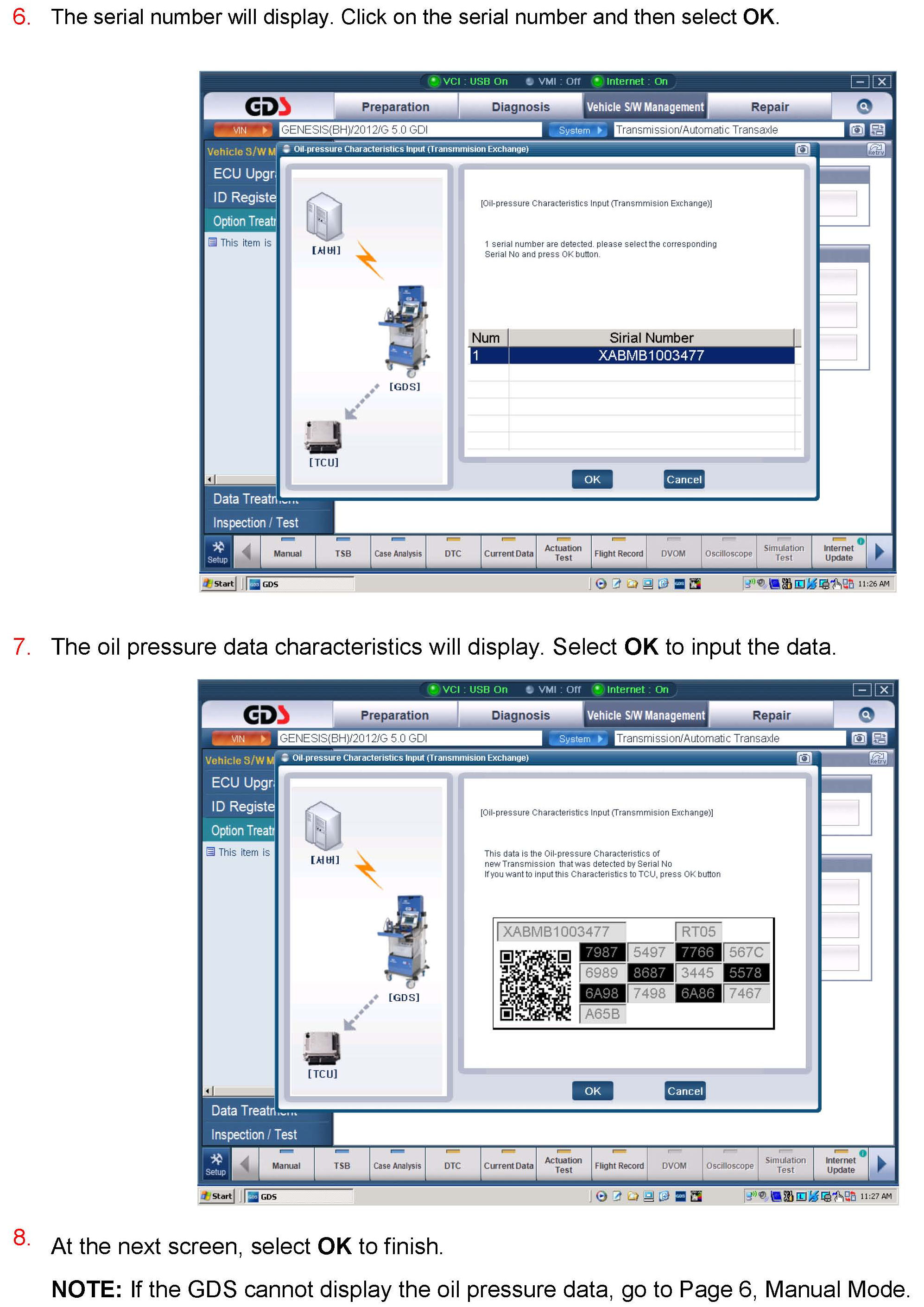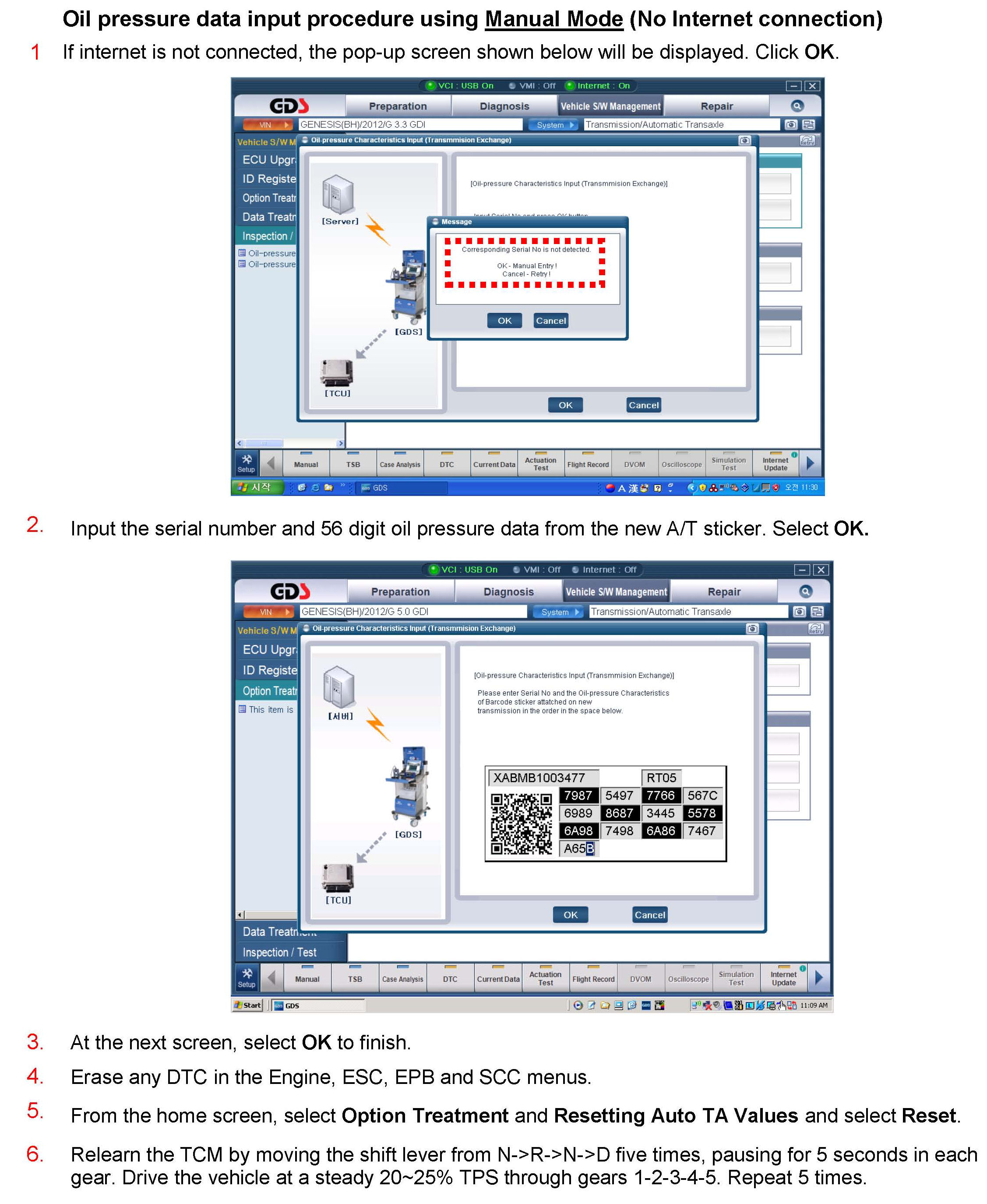 1. After replacing an 8-speed transmission: Download the oil pressure data of the new transmission from the GSW server and then input the data into the TCM using the GDS.