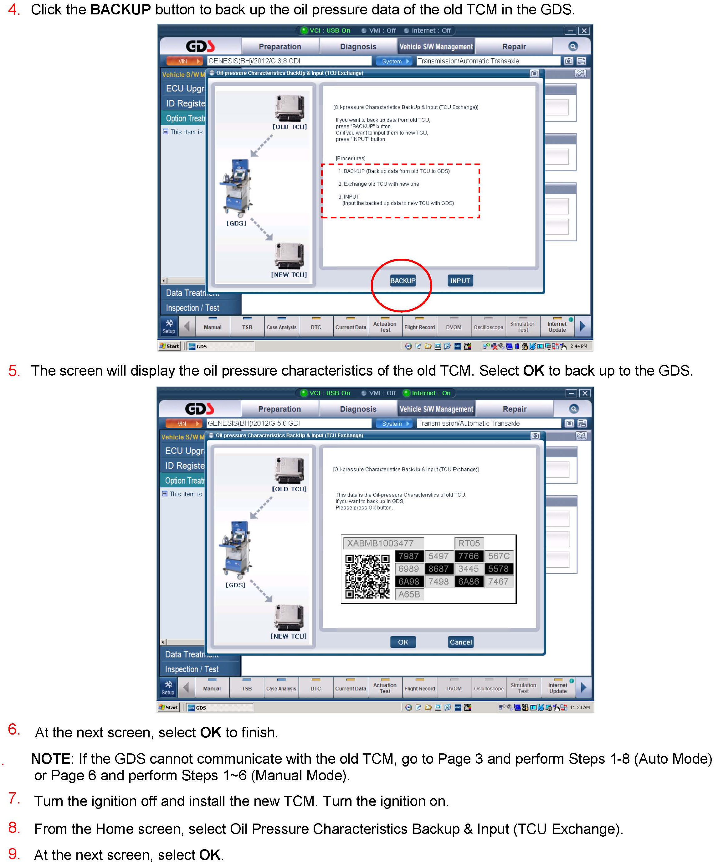 2. After replacing a TCM: Back up the oil pressure data from the old TCM into the GDS and then transfer the data into the new TCM.