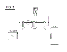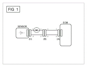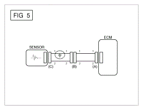 - With each connector still connected, measure the voltage between the chassis ground and terminal 1 of each connectors (A), (B) and (C) as shown in [].