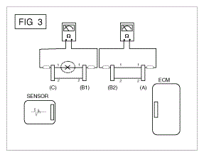- Disconnect connector (B), and measure for resistance between connector (C) and (B1) and between (B2) and (A) as shown in [Fig 3].