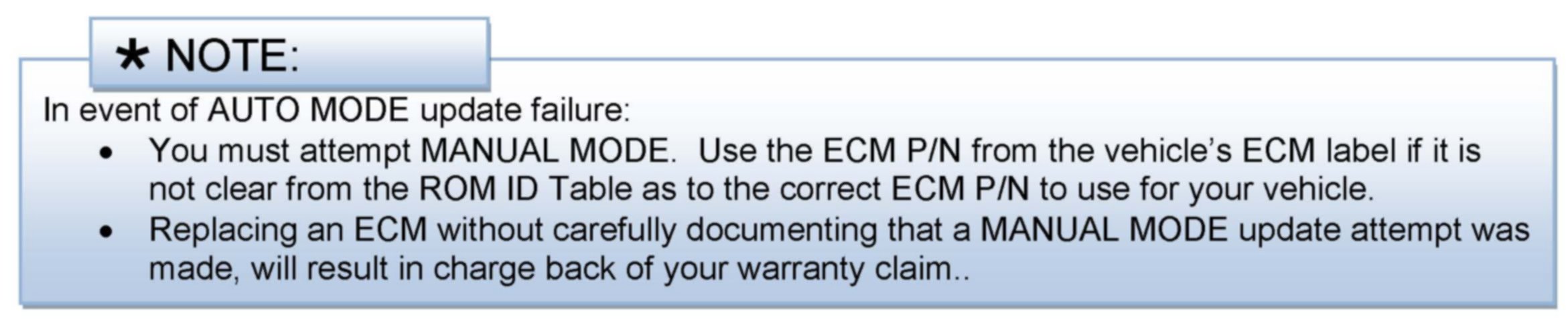 IMPORTANT REPAIR STEPS: Be sure to perform steps 10-12 of ECM reset and ETC Initialization (10 secs Ign OFF/10 secs Ign ON/10 secs Ign OFF) after ECM Update.
