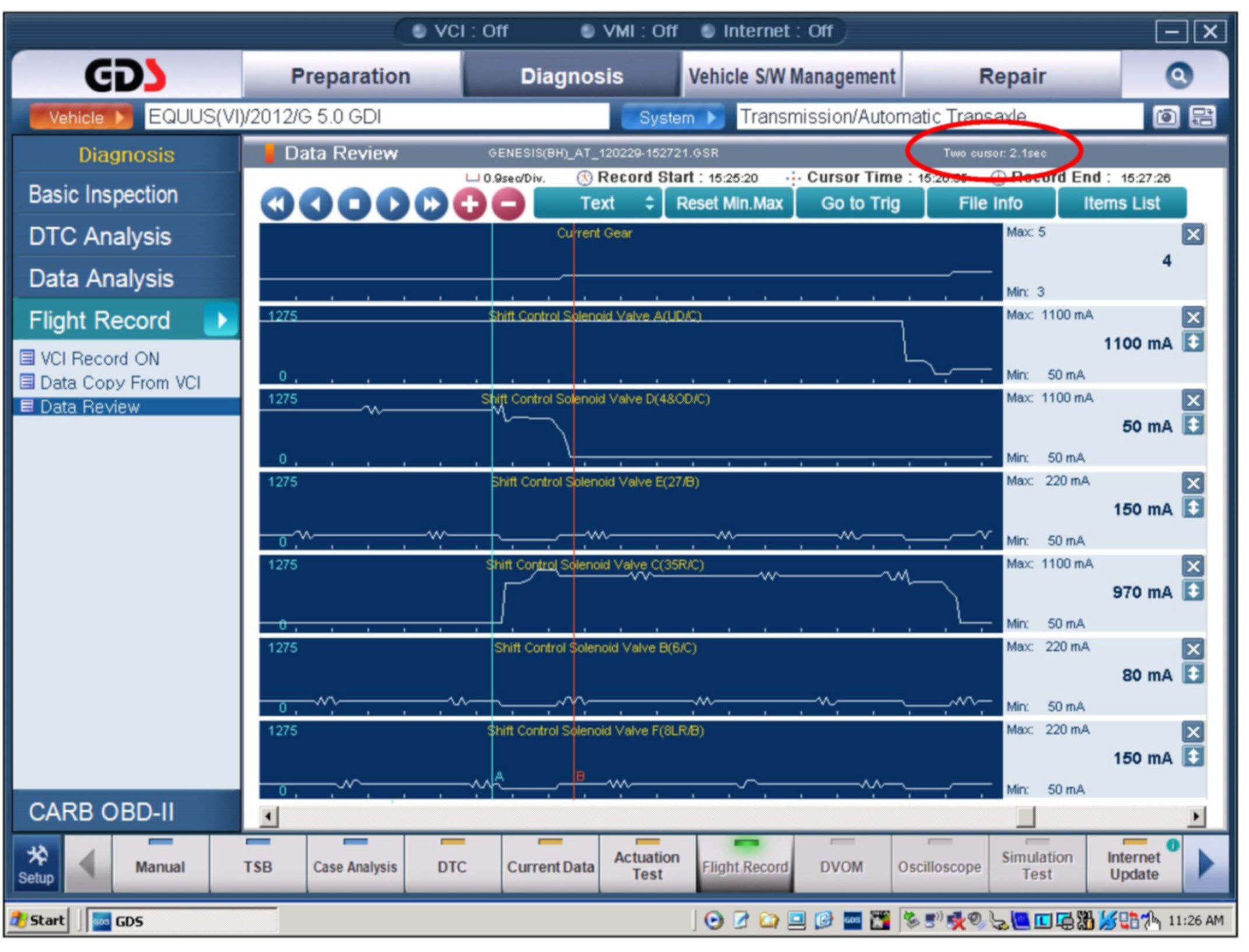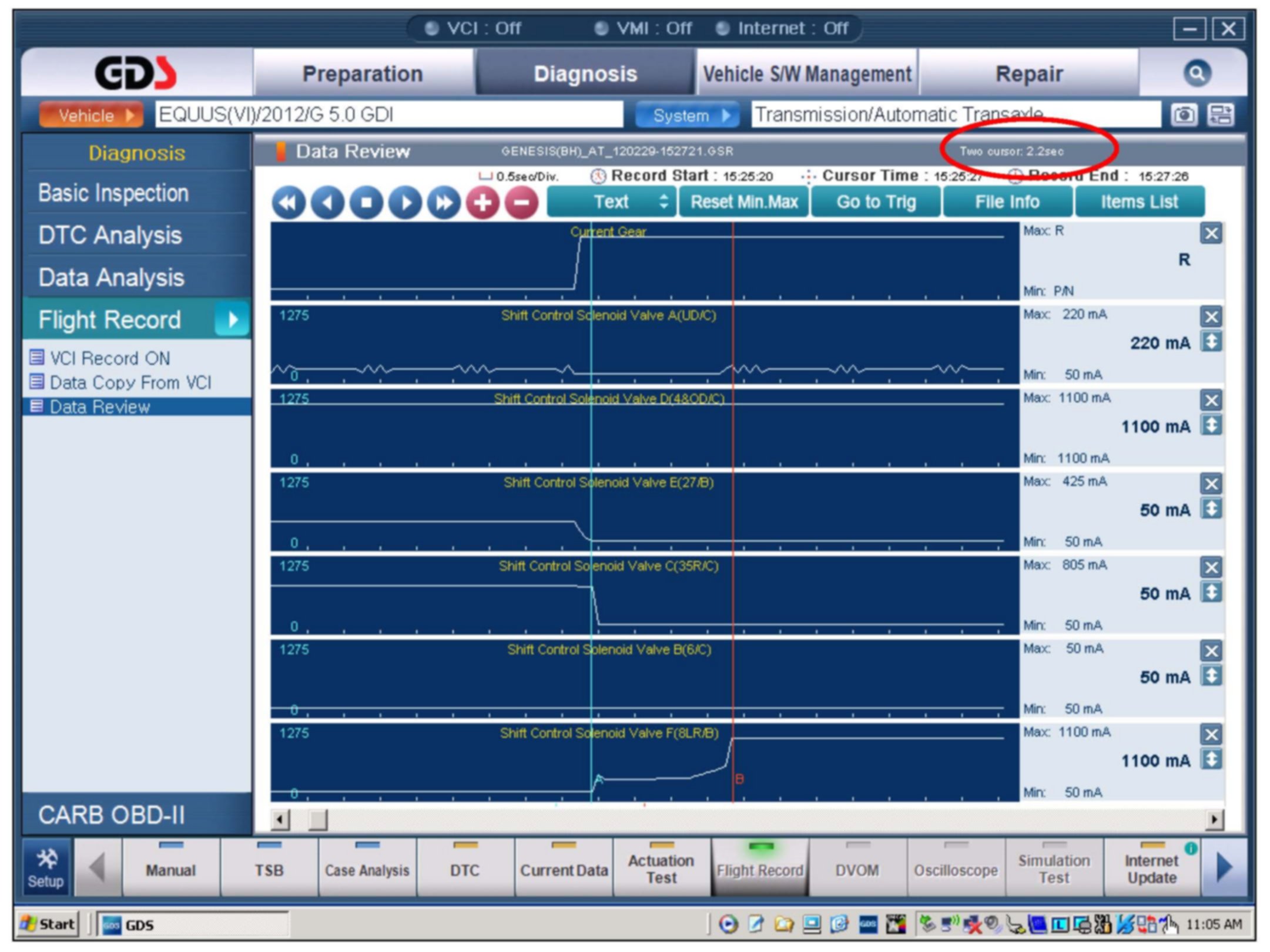 1. Attach the GDS and check for Diagnostic Trouble Codes in both the "Engine" and "Automatic Transaxle" menu. If DTC are found, repair according to the appropriate TSB or shop manual.