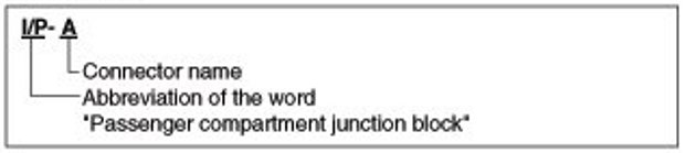 A Connector identification symbol consists of a wiring harness location classification symbol corresponding to a wiring harness location and number corresponding to the connector.