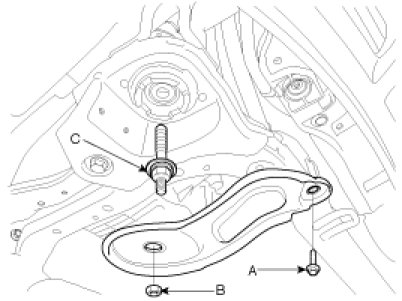 12. Remove the sub frame stay mounting bolts (A), nuts (B) and the sub frame mounting bolts (C) by supporting it with a jack.