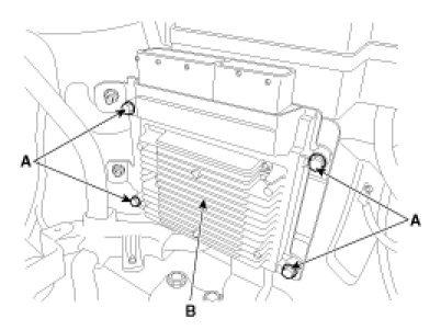4. Remove the mounting bolts (A), and then remove the ECM (B).