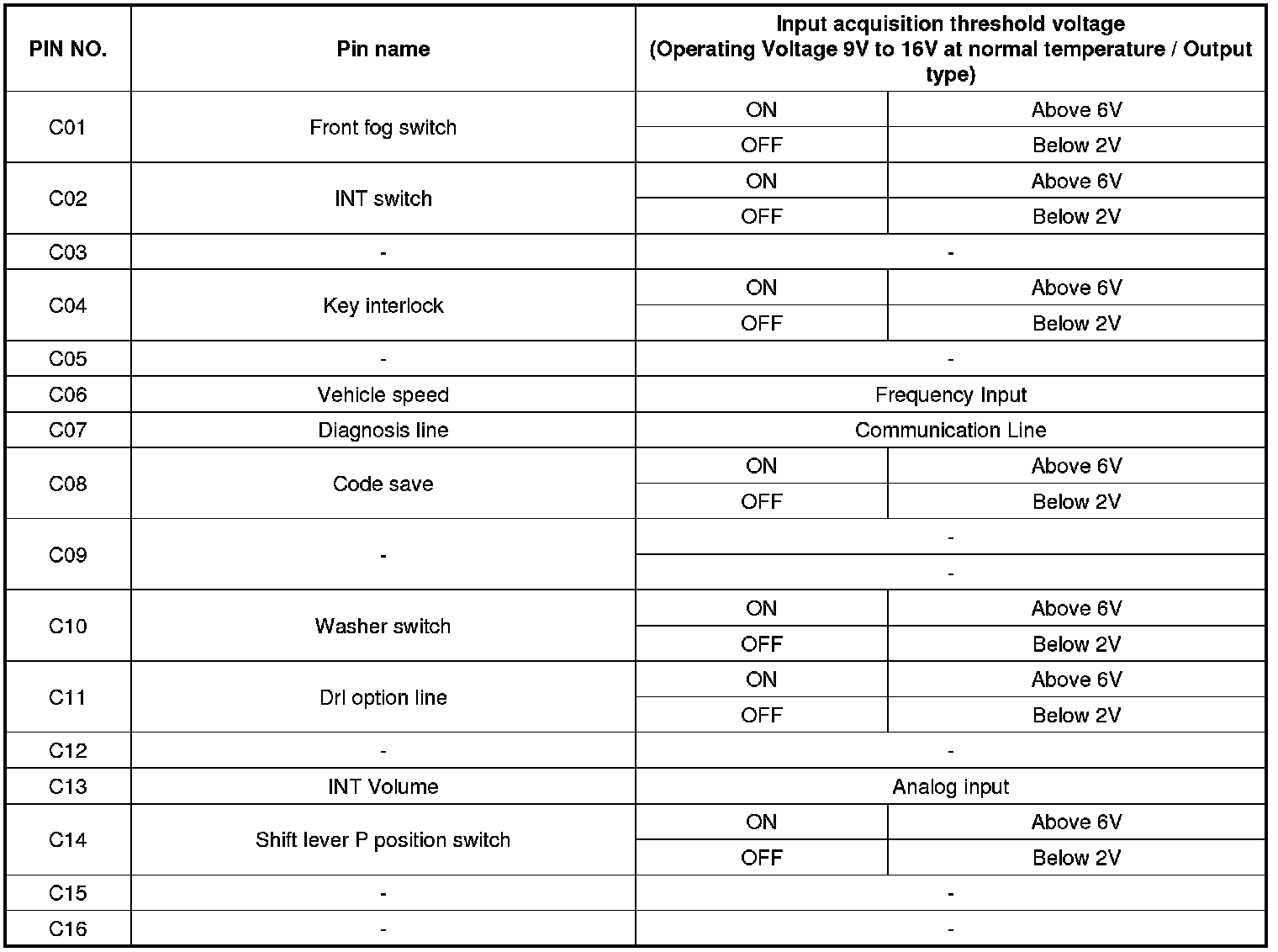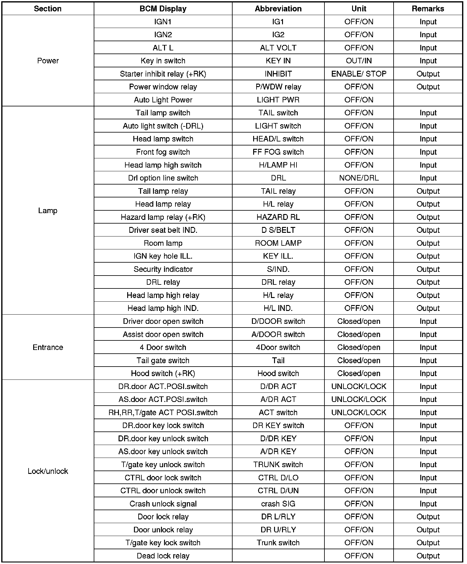 BCM Input/output Specification