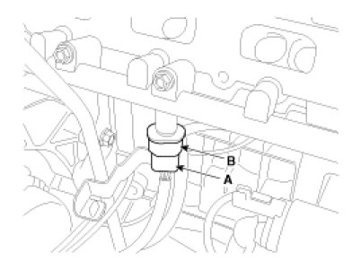 4. Disconnect the rail pressure sensor connector (A), and then remove the sensor (B) from the delivery pipe.