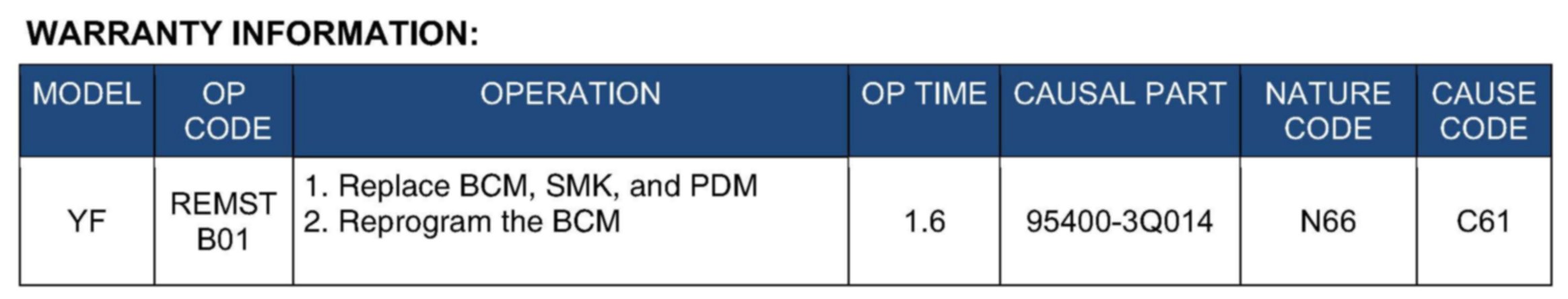 This bulletin describes the procedure of replacing the BCM, SMK, PDM, and reprogramming of the BCM to provide Blue Link remote start capability for 2012MY Sonatas produced from Start of Production through 9/27/2011.
