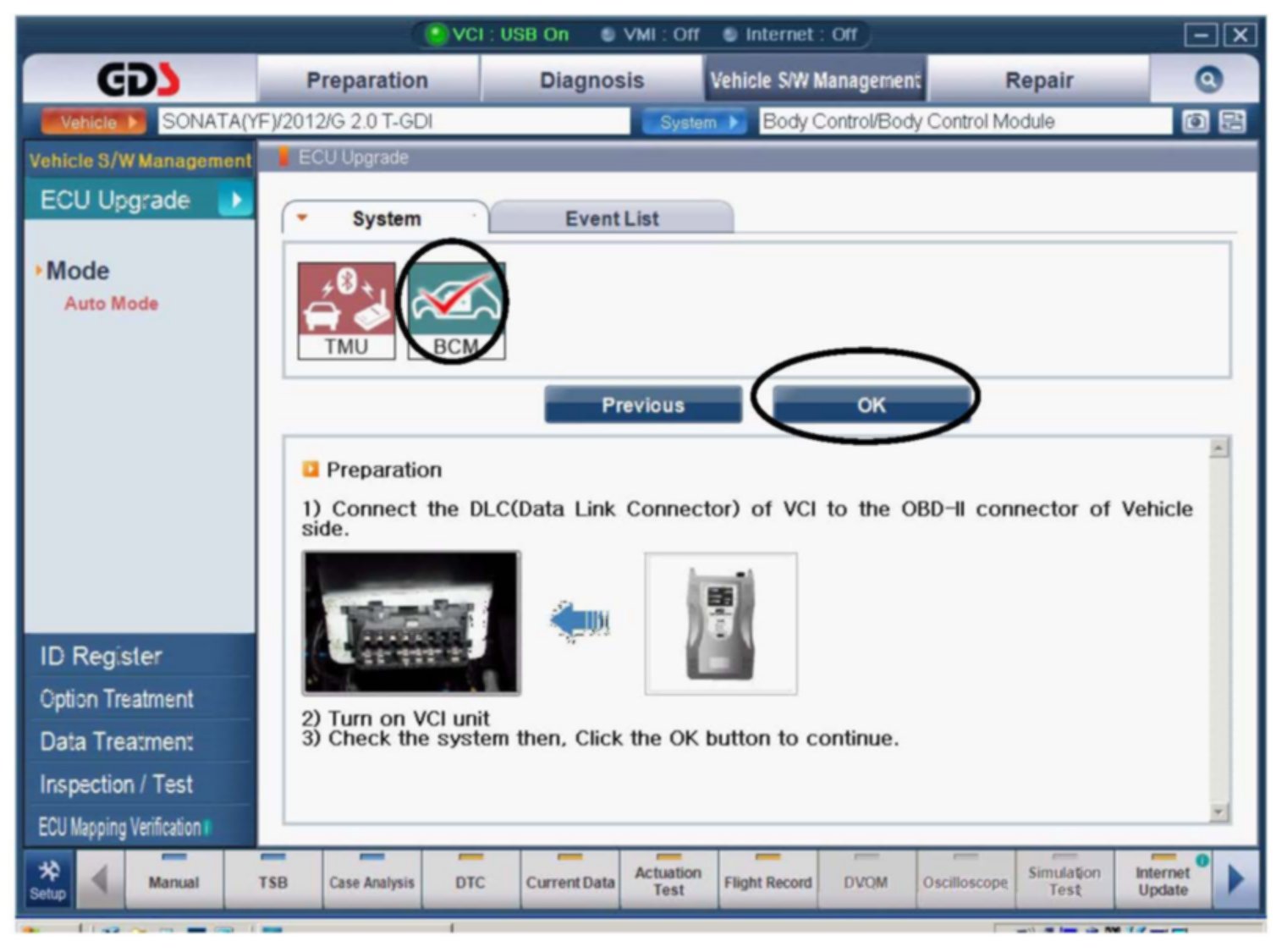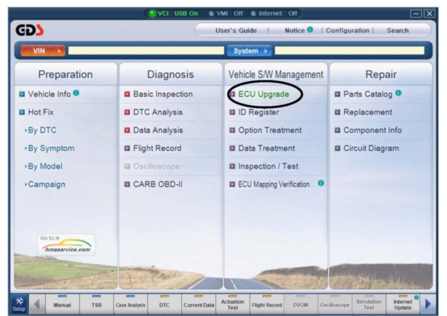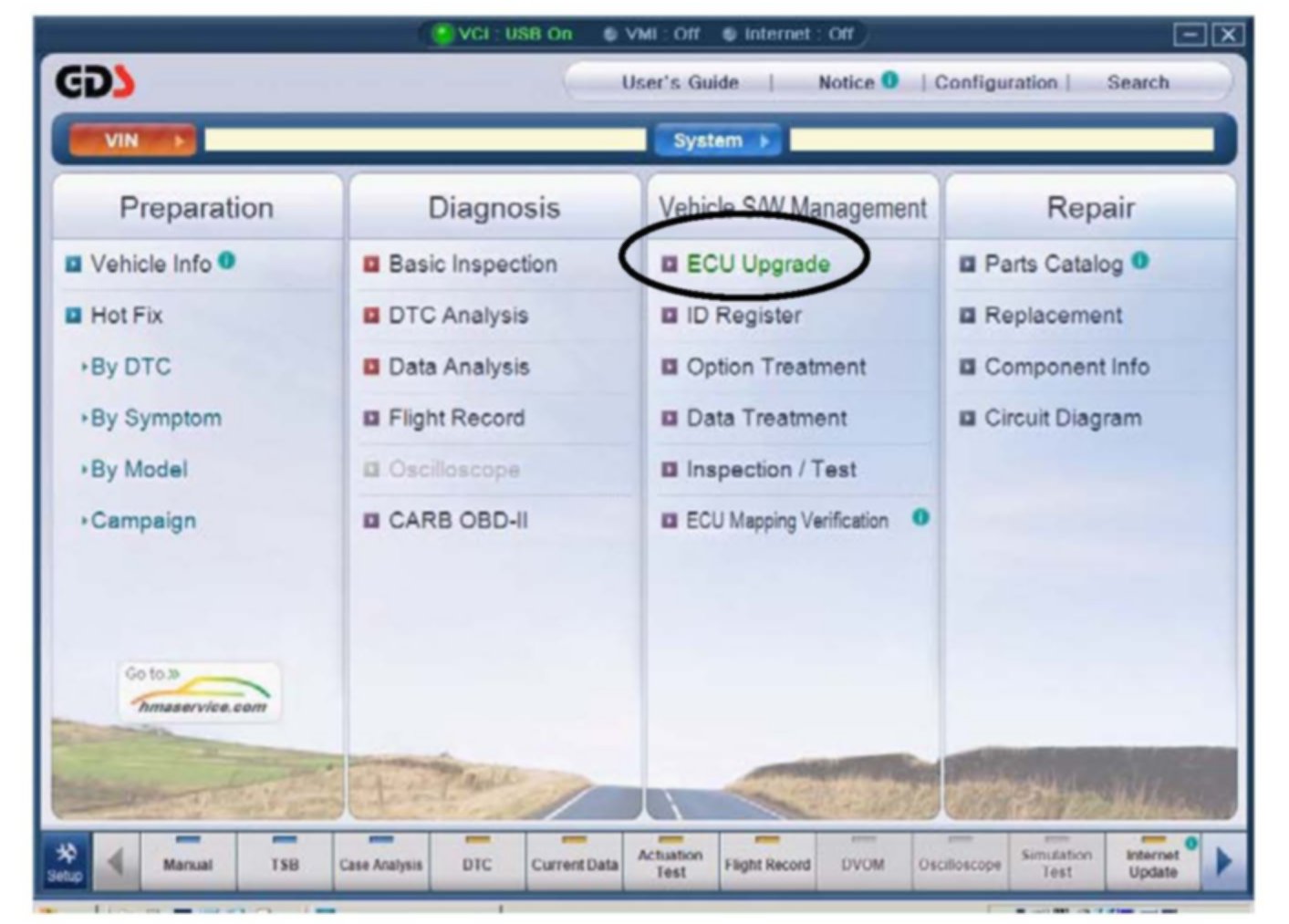 5.1 From the GDS home page, select ECU Upgrade. After selecting ECU Upgrade, if the GDS does not automatically detect the VIN, then manually enter the VIN number.