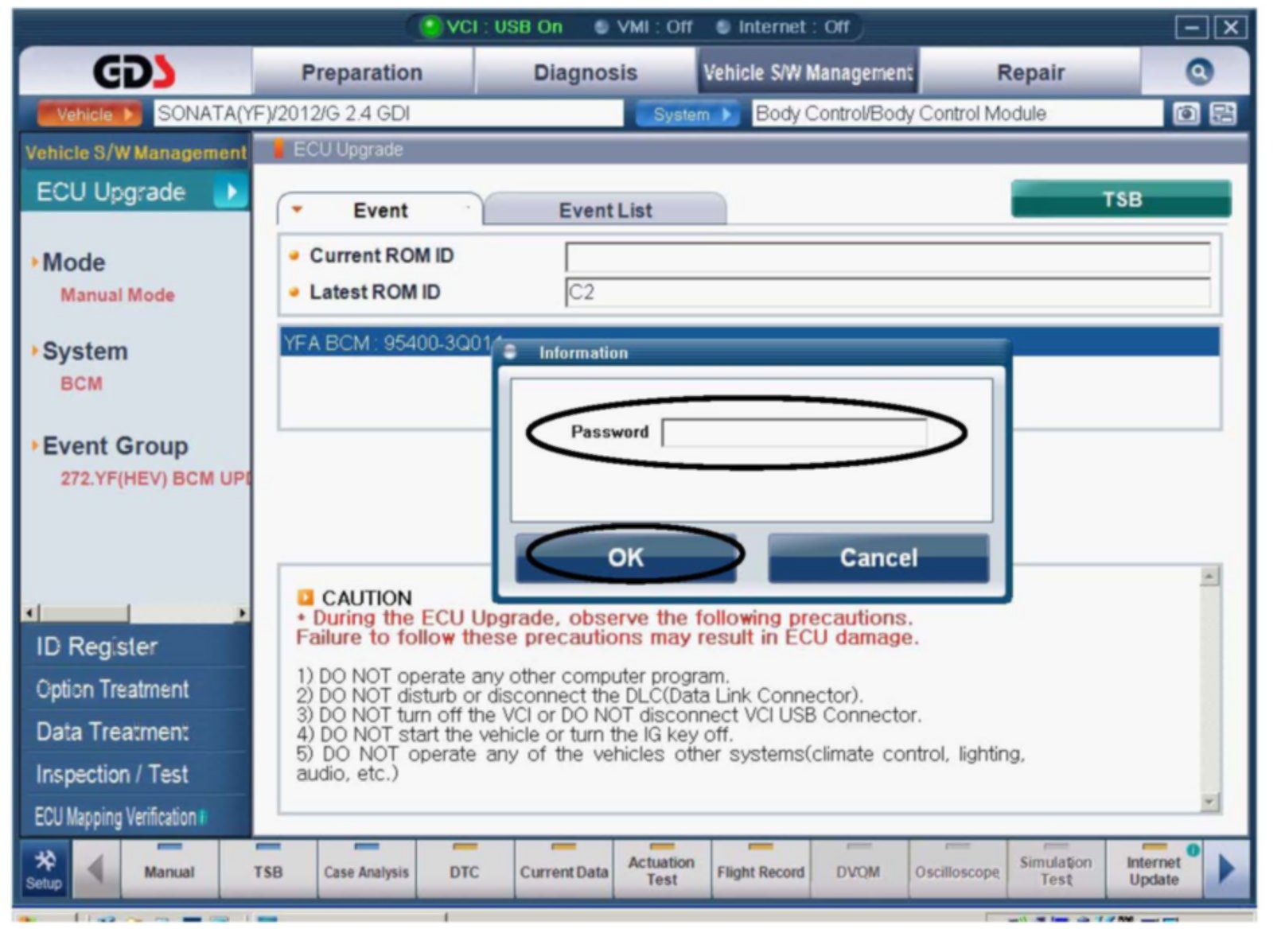 6.6 Select "YFA BCM: 95400-3Q014" and then select Upgrade. A pop up screen will request for a Password. Enter 3014 and then select OK.
