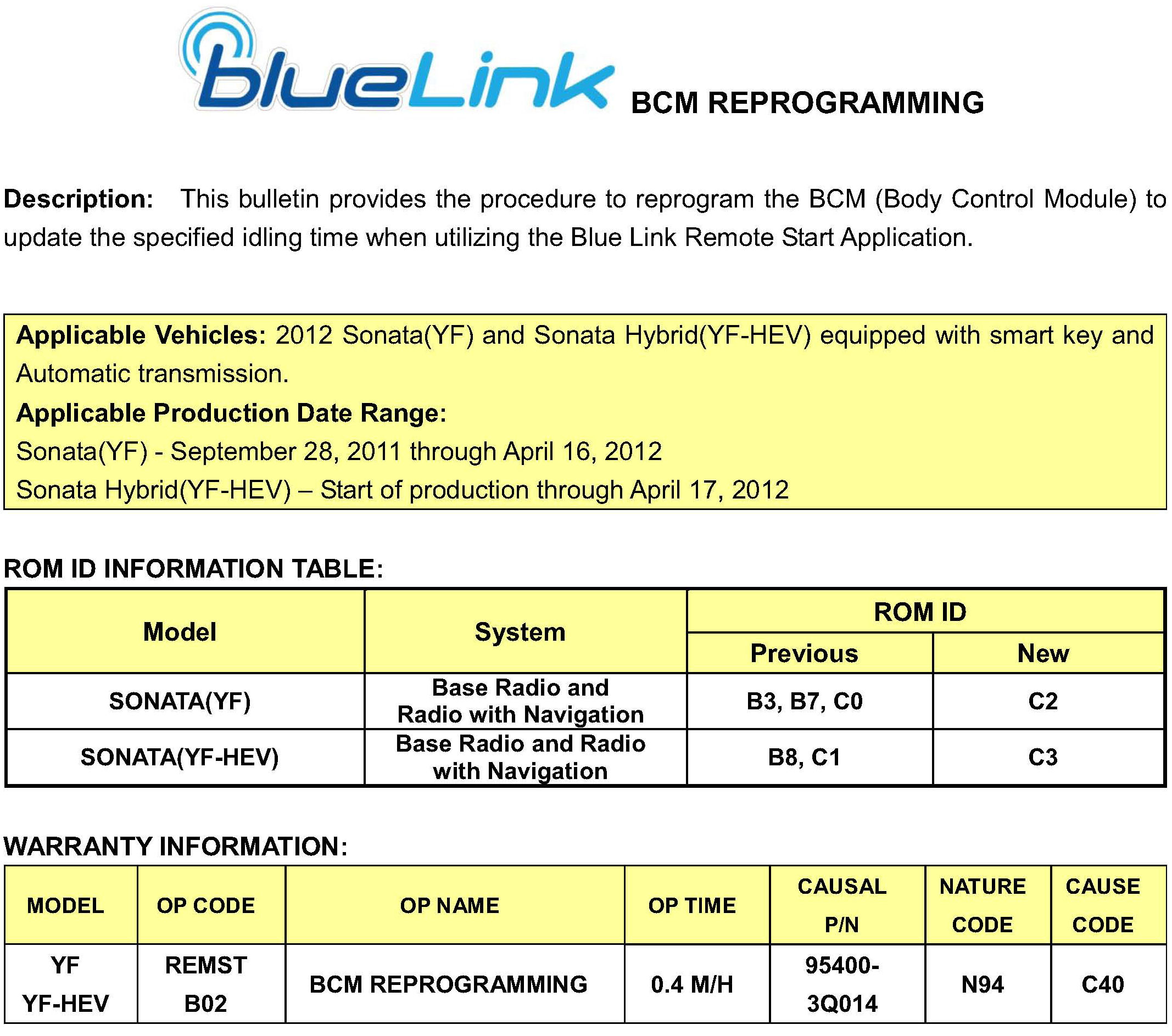 This bulletin supersedes TSB # 12-BE-009 to include BCM reprogramming for Sonata Hybrid YF-HEV.