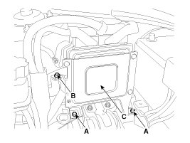 4. Remove the mounting bolts (A) and nut (B), and then remove the ECM (C).