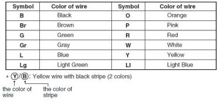 The following abbreviations are used to identify wire colors in the circuit schematics.
