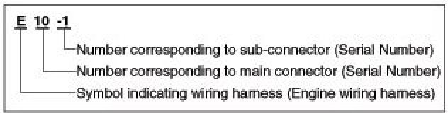 A Connector identification symbol consists of a wiring harness location classification symbol corresponding to a wiring harness location and number corresponding to the connector.
