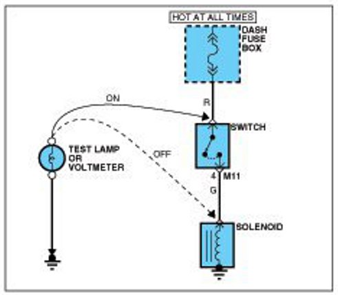 A. Connect one lead of a test lamp or voltmeter to a ground. If you are using a voltmeter, be sure it is the voltmeter's negative test lead you have connected to ground.