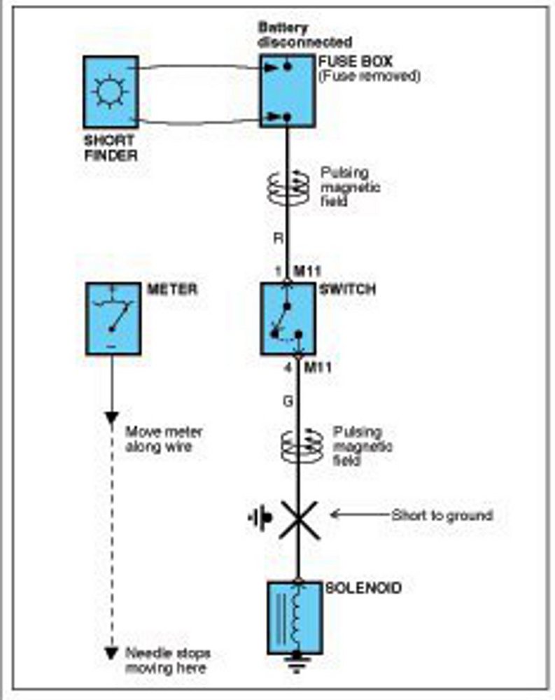 A short finder is available to locate a short to ground. The short finder creates a pulsing magnetic field in the shorted circuit and shows you the location of the short through body trim or sheet metal.