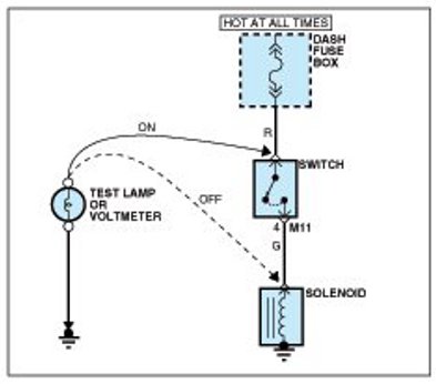 A. Connect one lead of a test lamp or voltmeter to a ground. If you are using a voltmeter, be sure it is the voltmeter's negative test lead you have connected to ground.