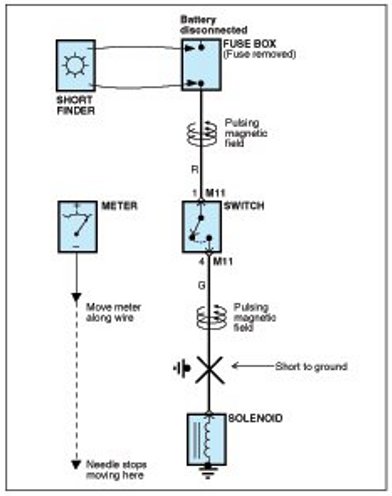 A short finder is available to locate a short to ground. The short finder creates a pulsing magnetic field in the shorted circuit and shows you the location of the short trough body trim or sheet metal.