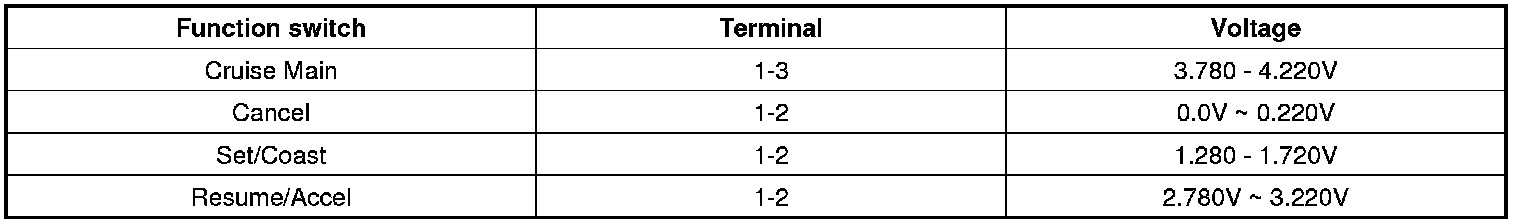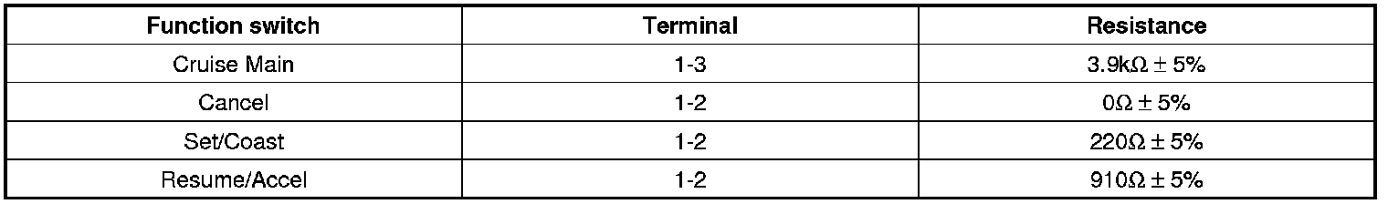 2. Measure resistance between terminals on the control switch when each function switch is ON (switch is depressed).