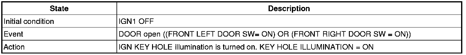 A. (While IGN KEY is inserted into the KEY CYLINDER (*) Or ACC is ON) & (IGN1 = IGN2 = ALT'L = OFF) if DRIVER SIDE DOOR is opened. KEY OPERATED WARN'G starts.