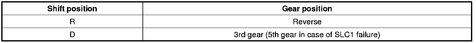 With the fail-safe function, if any malfunction should occur in the automatic transmission system, the TCU will output a control signal, and control will be performed to make traveling a minimum distance possible. If shift solenoid malfunction, the TCU will cancel the output of control signals to the solenoid. If this happens, automatic transmission gear shifting will be controlled by oil pressure circuits only and the gears will shift as shown in the chart below.