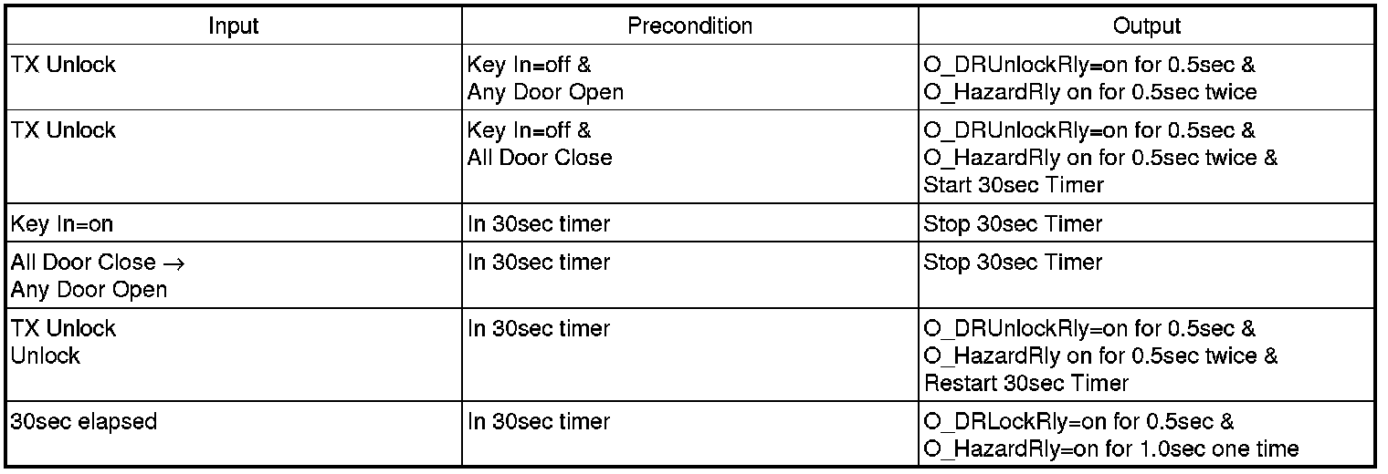 (11) After Unlock condition, and if the condition is not kept for 0.5sec, perform O_DR Unlock Rly=on However, after L_DRV DR Unlock SW or L_AST DR Unlock SW is meeting with the condition by Unlock->Lock and after 0.5sec, and if Key In=off do not perform O_DR Unlock Rly=on