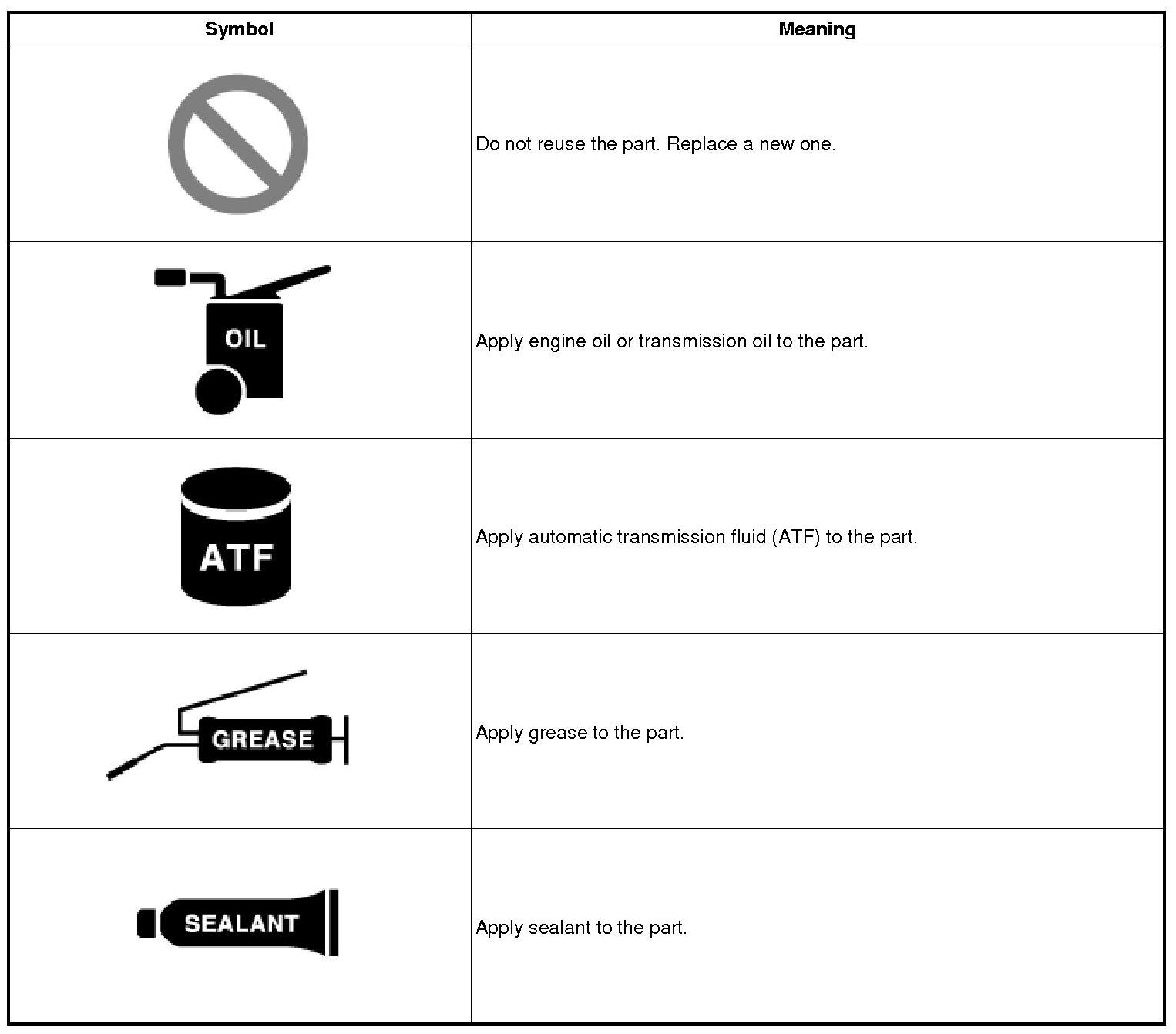 There are five primary symbols used to complement illustrations. These symbols indicate the part to apply such materials during service.