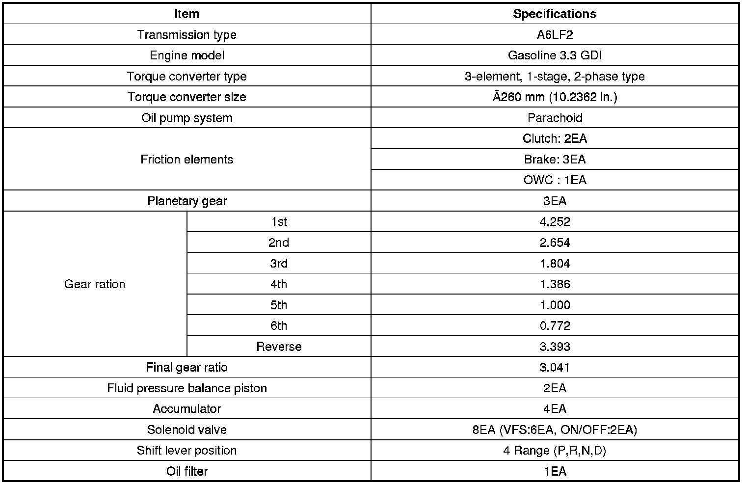 Home >> Hyundai >> 2013 >> Azera V6-3.3L >> Repair and Diagnosis >> Specifications >> Mechanical Specifications >> Automatic Transmission/Transaxle >> System Specifications