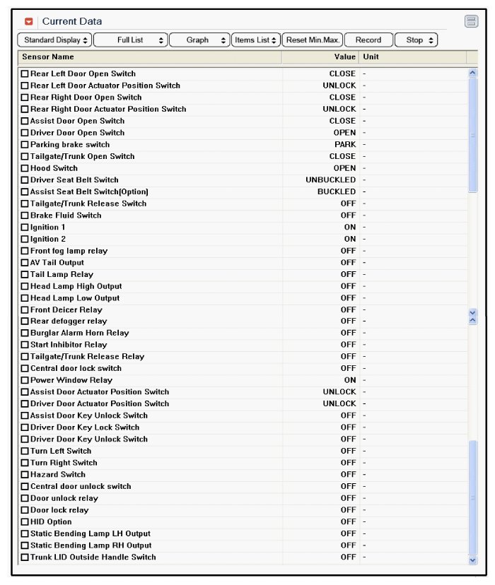 3. To consult the present input/output value of BCM, "Current DATA". It provides information of BCM input/output conditions of power supply, turn signal/brake lamp, headlamp, door, locks, outside mirror, wiper, auto-light and transmitters etc.