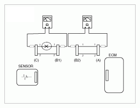 - Disconnect connector (B), and measure for resistance between connector (C) and (B1) and between (B2) and (A) as shown in [Fig 3].