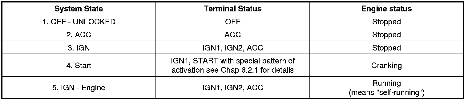 Referring to the terminals, the system states described in the table above are same as those one found in a system based on a mechanical ignition switch. The one of distinction with Mechanical-Ignition-Switch based system is that the BES system allows specific transition from [OFF] to [START] without going through [ACC] and [IGN] states.