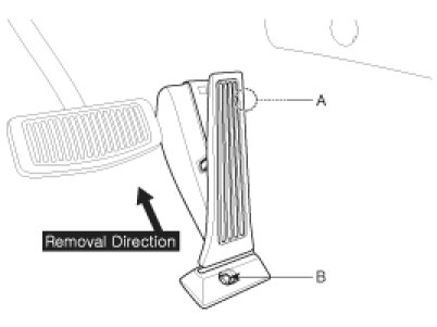 3. Remove the accelerator pedal in the direction of "Removal direction" in the figure after removing the installation bolt (B).
