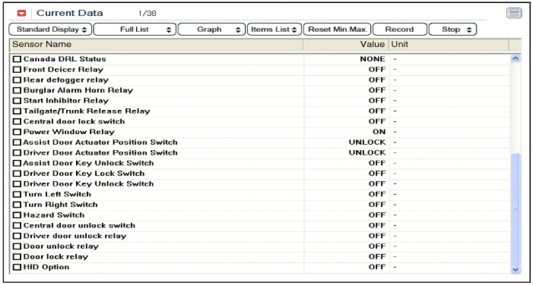3. To consult the present input/output value of BCM, "Current DATA". It provides information of BCM input/output conditions of power supply, turn signal/brake lamp, headlamp, door, locks, outside mirror, wiper, auto-light and transmitters etc.