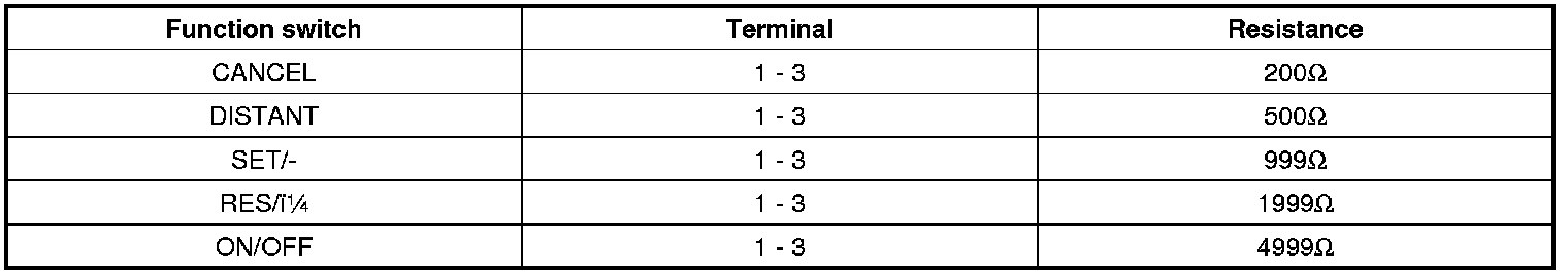 2. Measure resistance between terminals on the control switch when each function switch is ON (switch is depressed).